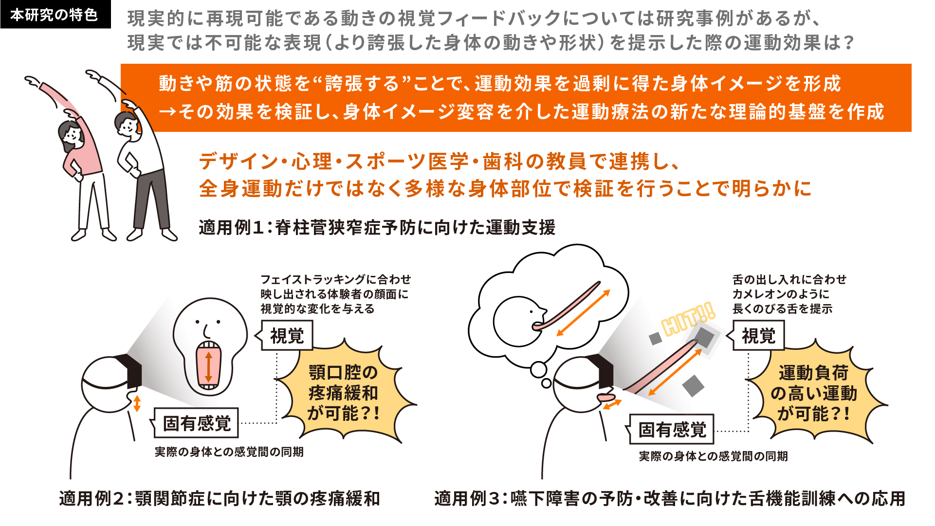 | 研究概要 | 身体リサイズ錯覚を応用した疼痛軽減手法は、補助者による触覚刺激を必要とするため、セルフケアとしての実施が困難であった。本研究では、外的刺激に代わって運動時の筋の緊張・弛緩に伴う固有感覚に着目し、錯覚を取り入れた体験者自身が単独で実施可能な効能感の高い運動環境を構築する。筋の伸張動作と同期して身体部位が伸長するなどの誇張表現を視覚フィードバックとして提示し、特に腰痛、顎関節症、口腔機能低下症や嚥下障害を対象として、部位特性に応じた有効な提示手法の確立を目指す。さらに、本環境下での誇張的身体イメージ提示が運動制御や疼痛緩和に及ぼす影響を検証し、身体イメージ変容を介した運動療法の新たな理論的基盤を提示する。 |