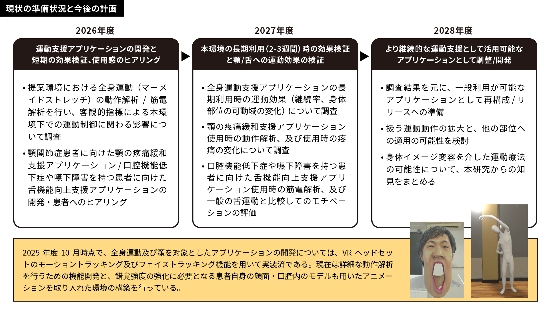 | 研究者の役割分担 | 石原 由貴(大学院社会産業理工学研究部・社会総合科学域・講師):錯覚を誘起する環境設計・構築・検証 鈴木 善貴(病院・歯科(かみあわせ補綴科)・講師):顎/口腔を対象とした運動の監修 渡邊 毅(大学院医歯薬学研究部・メディカルAIデータサイエンス・助教):疼痛に関する錯覚誘起手法についての知見交換 藤谷 順三(大学院医歯薬学研究部・地域運動器・スポーツ医学分野・特任准教授):全身運動を対象とした運動の監修 山本 哲也(大学院社会産業理工学研究部・社会総合科学域・教授):仮想環境提示時の心理的効果についての知見交換 新開 瑞希(病院・歯科(かみあわせ補綴科)・助教):顎/口腔運動の機能解析 谷脇 竜弥(病院・歯科(かみあわせ補綴科)・医員):被験者の三次元形態記録 冨田 洋介(高崎健康福祉大学・保健医療学部理学療法学科・准教授):動作・筋運動の解析手法の監修 |