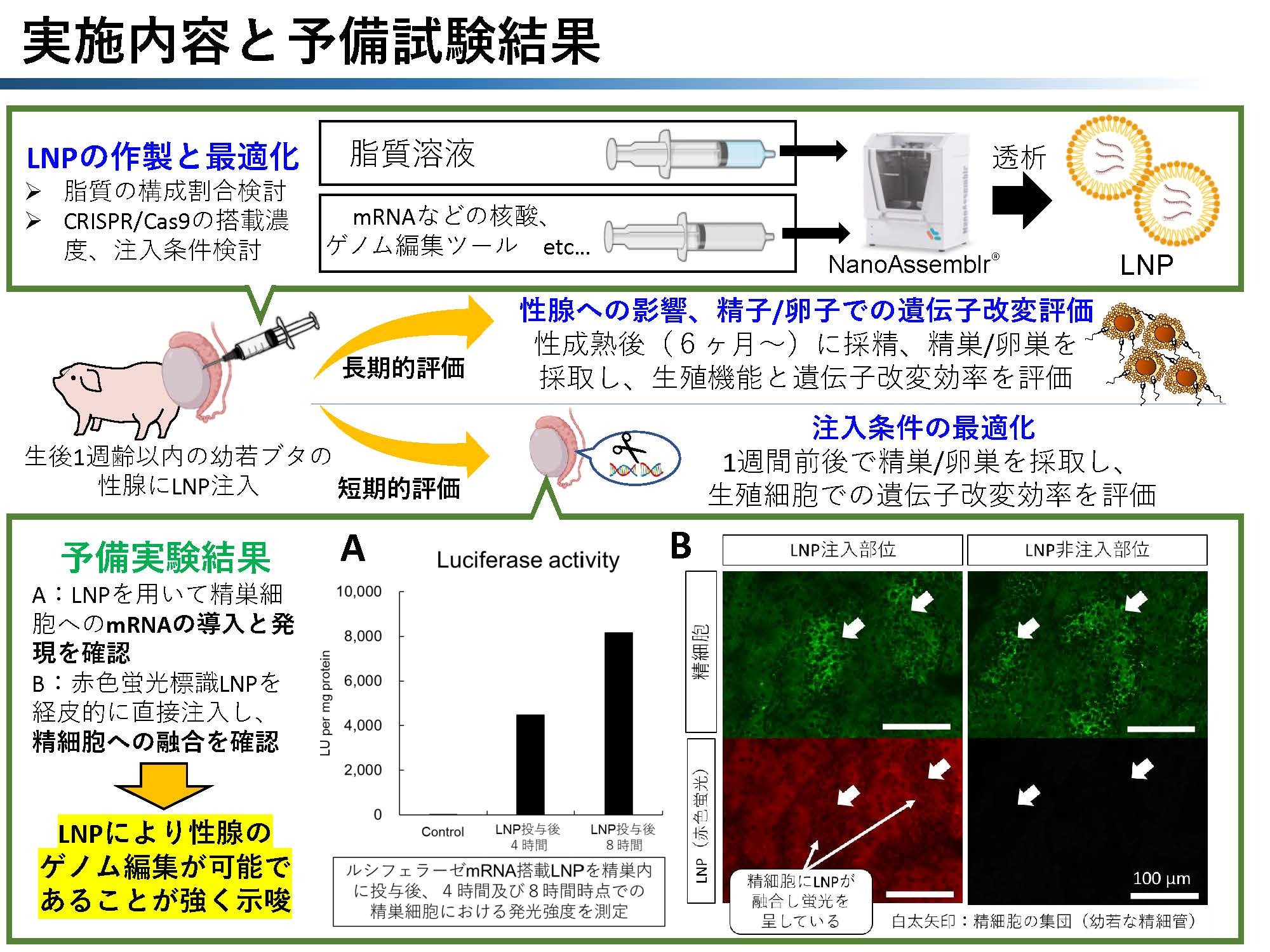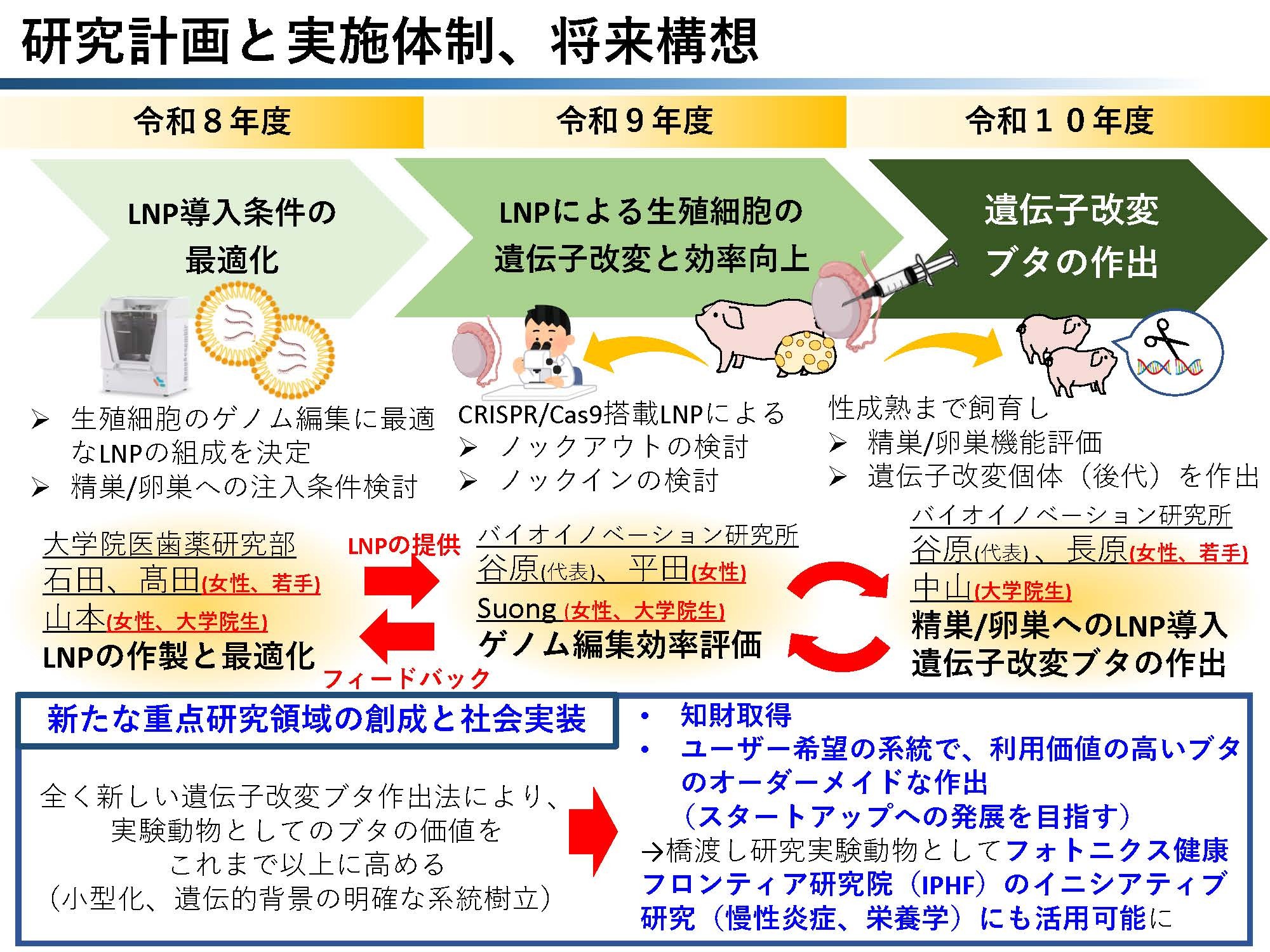 | 研究者の役割分担 | 谷原 史倫(バイオイノベーション研究所・先端医療技術開発部門・教授)研究総括、遺伝子改変ブタの作出 平田 真樹(バイオイノベーション研究所・先端医療技術開発部門・教授)ゲノム編集効率評価、ノックイン配列のデザインと作成 長原 恵(バイオイノベーション研究所・先端医療技術開発部門・准教授)精巣/卵巣へのLNP導入、LNPの導入条件最適化 石田 竜弘(大学院医歯薬学研究部・薬物動態制御学分野・教授)LNPの作製と最適化 髙田 春風(大学院医歯薬学研究部・薬物動態制御学分野・助教)LNPの作製と最適化、mRNA発現解析 山本 遥香(大学院医歯薬学研究部・薬物動態制御学分野・博士課程2年【うずしおスカラー】)LNPの作製と最適化、mRNA発現解析 Suong T Nguyen(バイオイノベーション研究所・先端医療技術開発部門・博士課程後期4年)ゲノム編集効率評価 中山 雄一朗(バイオイノベーション研究所・先端医療技術開発部門・博士課程前期2年)精巣/卵巣へのLNP導入、遺伝子改変ブタの作出 |