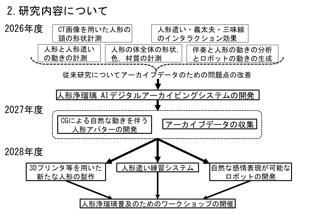 | 研究課題名 | 匠の技術のAIデジタルアーカイビング 〜伝統芸能を最先端技術で未来に遺す,伝える,伸ばす〜 |