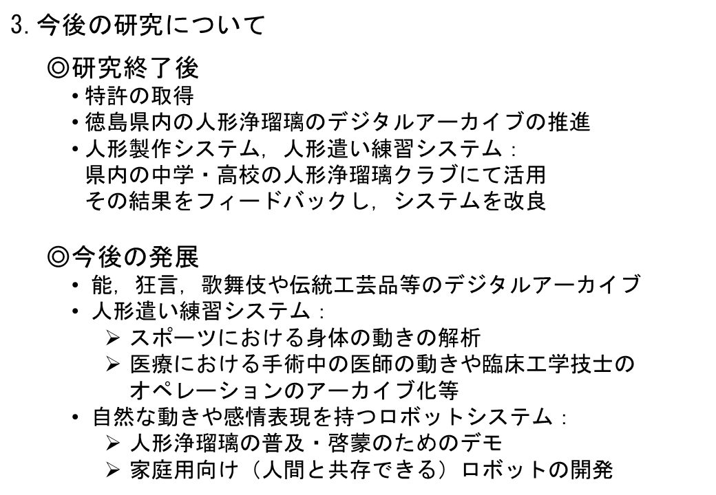 | 研究概要 | 本研究は,徳島の伝統芸能である阿波人形浄瑠璃を未来に伝えるための,AIデジタルアーカイブと,それを活用したシステムの開発を行う.申請者らは,これまでに,CT画像を用いた人形の形状計測,人形と人形遣いの動作計測,三味線の伴奏と動きの分析,人形遣い・義太夫・三味線のインタラクション効果の解析について個別に研究を行なってきた.ここでは,これらの研究で得られたデータを,AIを用いて統一的なデジタルアーカイブ情報とするシステムを構築する.そして,このアーカイブ情報を用い,3Dプリンタによる人形製作システム,人形遣い練習システム,自然な感情表現が可能なロボットシステムを開発し,人形浄瑠璃普及ワークショップを開催する.本研究によるシステムは,能・狂言・歌舞伎等のデジタルアーカイブやスポーツでの運動解析,医療での遠隔診断や手術技術への活用も期待できる. |
