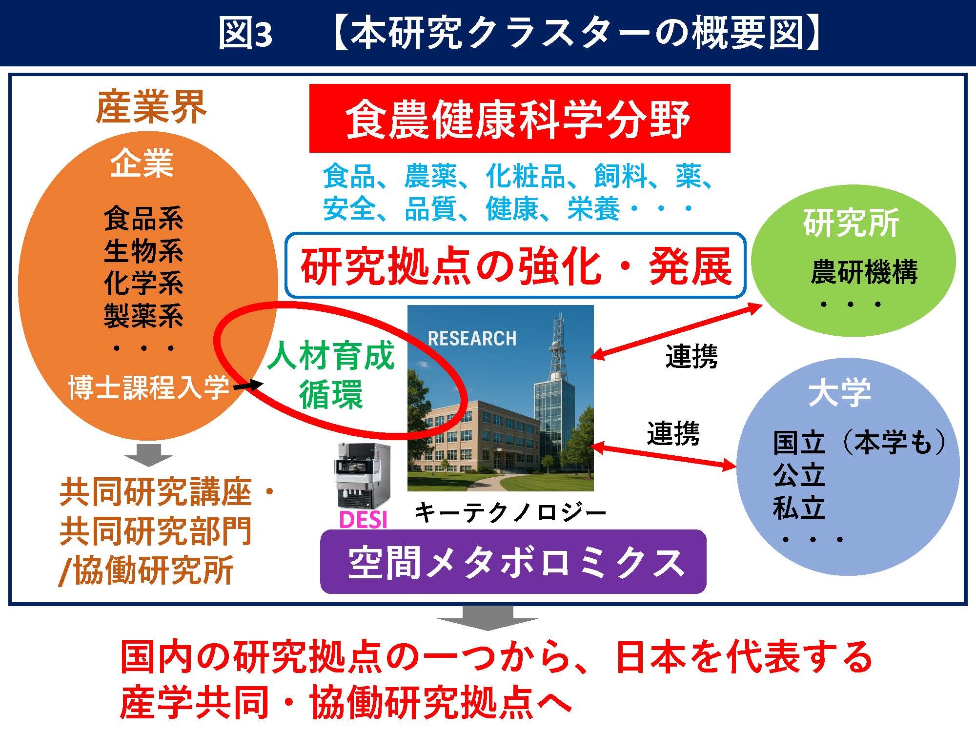| 研究概要 | メタボロミクスは、一次元的な質量分析を用いて動植物や食品中の代謝物を網羅的に解析する技術であり、生命現象や食品品質の理解に寄与してきた。しかし、従来法では代謝物が「どこに?」という空間情報を得ることができず、動植物や食品の本質的理解には限界があった。空間メタボロミクスは、試料切片上を二次元的に質量分析することで代謝物分布を網羅的に可視化できる革新的技術であり、近年は学術分野のみならず産業界からの注目も高まっている。申請者の榎元は約15年前から食農健康科学分野への応用研究を進め、複数企業との共同研究を展開しており、国内研究拠点の一つとして機能している。本研究クラスタ―では、これまでの連携基盤をもとに、技術の高度化、企業との協働体制の深化、博士課程学生の人材育成循環を通して、食農健康科学分野における日本を代表する産学共同・協働研究拠点へとさらに強化・発展させることを目指す。 |